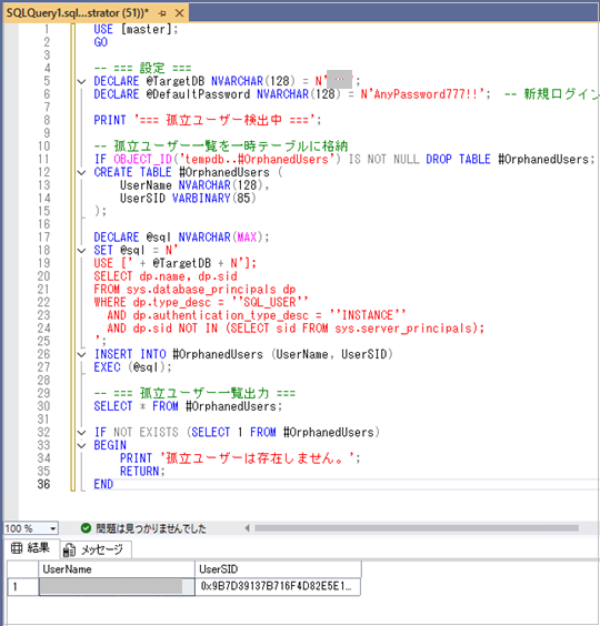 前項の sql で孤立ユーザーの存在を確認できた場合に修復を試みてください。