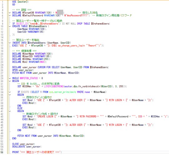 DECLARE @DefaultPassword NVARCHAR(128) = N'AnyPassword777!!'; -- 新規ログイン用任意パスワード