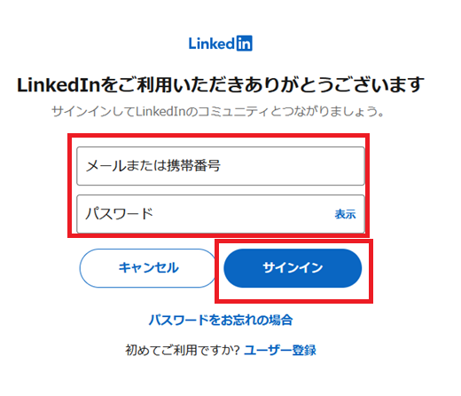 - LinkedIn アカウントのメールアドレスとパスワードを入力し [サインイン] をクリックしてください。