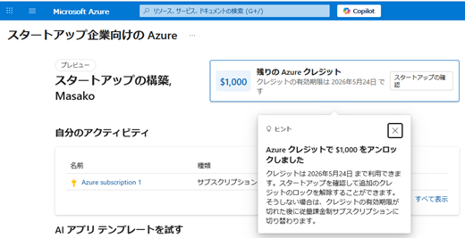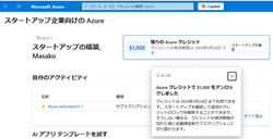 - これで、1,000ドルの Azure クレジットをゲットできました。