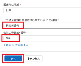 [会社の登録 ID 番号] は個人事業主の場合は該当するものがないので [N/A] を入力します。