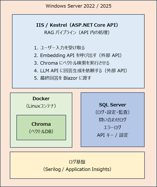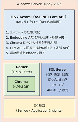 ├─ IIS / Kestrel(ASP.NET Core API) ├─ Docker(Linux コンテナ) ├ └─ Chroma(ベクトルDB) ├─ SQL Server(ログ・設定・ユーザー管理) └─ ログ基盤(Serilog / Application Insights) |